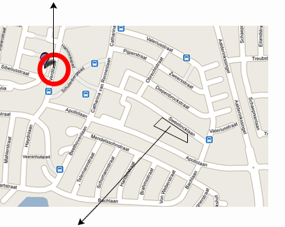 Hier gaat u rechtsaf, met de bocht mee naar links, en dan is het de eerste straat rechts.
